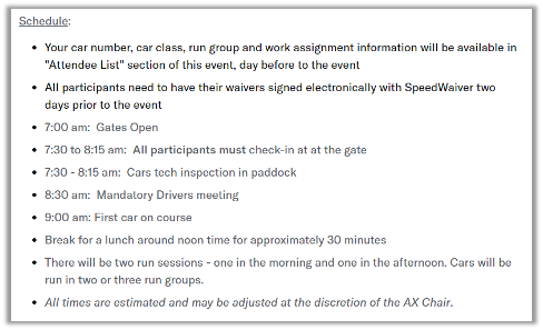 Listing the basic schedule for a race event, or a starting point for a driving tour are great ways to set the stage for an exciting day of driving/riding. This also ensures folks are aware of the start times before signing up, which will reduce cancellations due to scheduling conflicts.