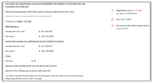 One of the most common reasons for incomplete registrations is finding the cost only once you’ve made it to the registration form. Many folks will move on from the advertisement page to another event when costs aren't clearly conveyed, or they'll email our support team asking for this information. Listing this in your advertisement improves the user experience and increases the likelihood of converting interested parties to registered attendees. Here is an example from one of our karting organizers that does a great job communicating participation costs in their advertisement. (*Note, GST = Goods & Service Tax, which is required in some Canadian provinces.)